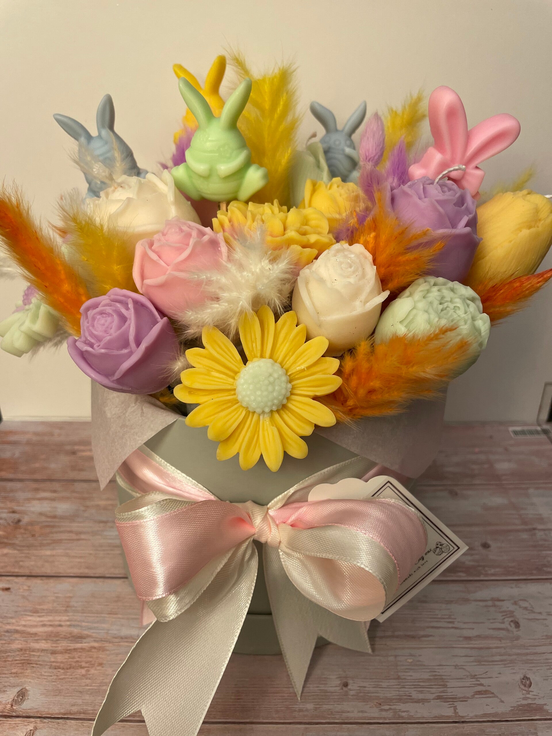 Dit is een medium kaarsboeket gemaakt van koolzaadwas. Dit boeket zit in een ronde doos van 18 x 11,5 cm.